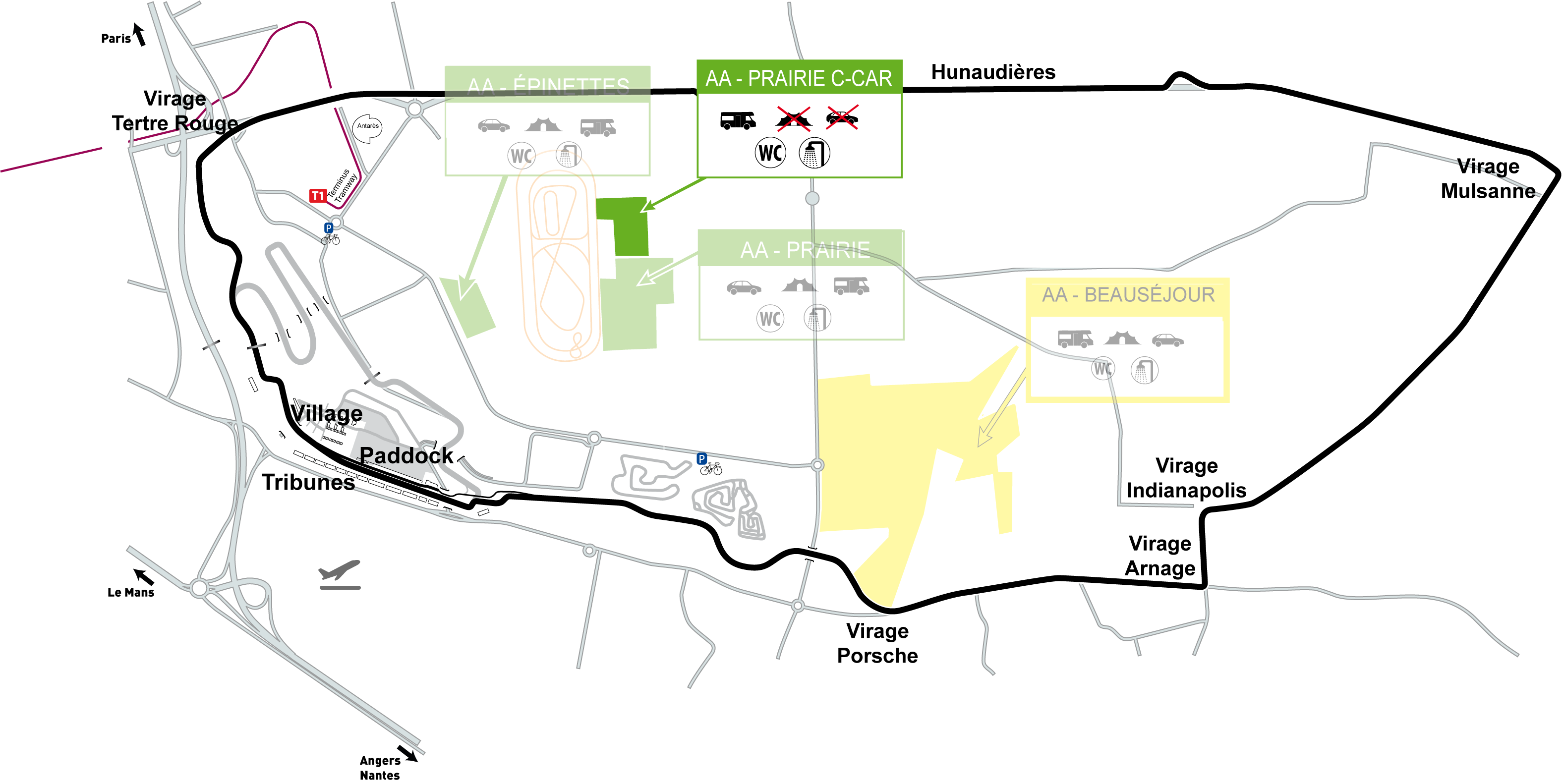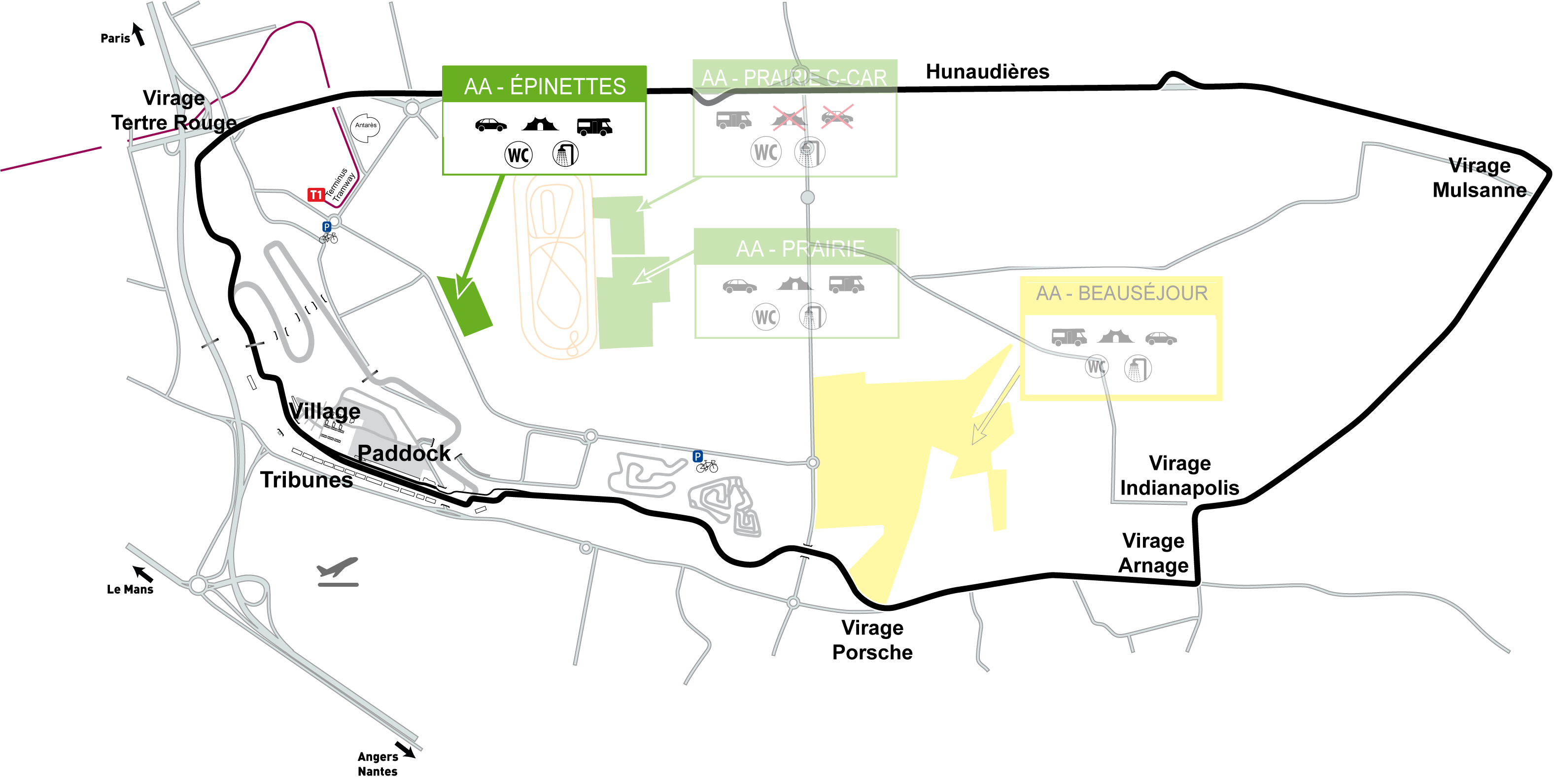 Chose this parking if you wish to park close to the Arnage and Mulsanne curves. Distant from the main area of the circuit (village, grandstands, entertainment area…), this parking can complete a parking from the main area.