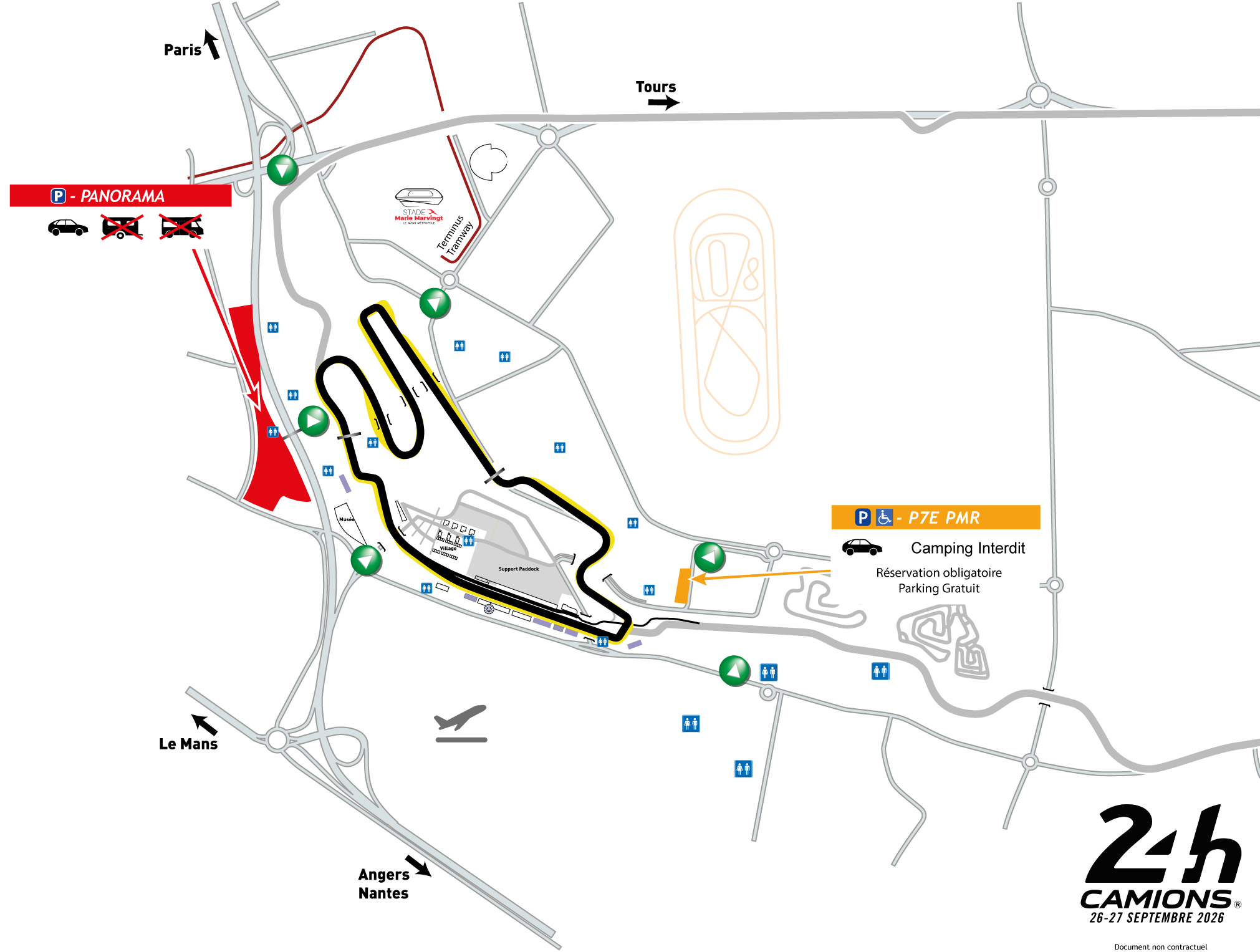 Espace dédié aux poids lourds souhaitant stationner à proximité du circuit. Ce parking est situé à l’arrière des tribunes et proche du Virage du Raccordement.